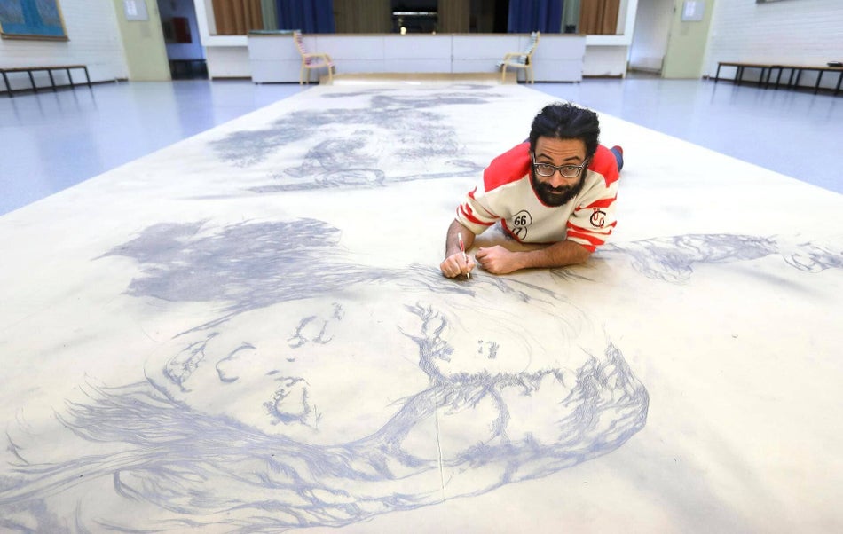 Puntini. Milioni di puntini battuti a matita e sfumati con le dita. Su un lenzuolo di carta lungo centro metri e alto quattro prende vita una Divina Commedia in bianco e nero, fatta di sole immagini. La più grande che sia mai stata realizzata. Virgilio e Dante, l’amore impossibile tra Paolo e Francesca, Caronte che traghetta le anime dannate, e poi, un po’ più in là, superata la linea dei cinquanta metri, ecco l’Eden, il paradiso terrestre, con Beatrice avvolta in una nuvola di fiori. Scene e personaggi delle tre cantiche si animano su un unico rotolo di carta – lungo quanto un campo da calcio – in un’opera che è pronta a entrare nel Guinnes.